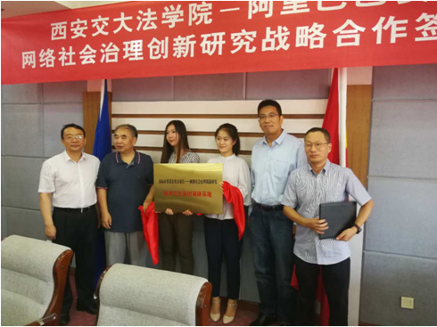 单文华院长与侯金刚总监代表双方签署了乐动官方网页版法学院与阿里巴巴安全部网络社会治理战略合作协议书。西安交大副校长席光、信息安全法律研究中心主任马民虎与阿里巴巴集团首席风险官刘振飞、安全部资深总监侯金刚,为“国家社科基金重大项目——网络社会治理创新研究阿里巴巴集团调研基地”揭牌。
