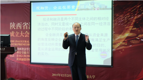 在与会代表合影后,会议进入第二时段的专题报告。报告由乐动官方网页版法学院知识产权研究中心主任、博士生导师马治国教授主持,陕西省法学会企业经济法治研究会顾问、西北政法大学经济法学院院长、博士生导师强力教授做了“新常态下企业投融机制创新的法律问题”讲座,阐释了中国经济已进入新常态,在新常态的条件下,企业应作出机制创新等相对应的变化,其变化主要体现在市场化,并强调投融资机制市场的多元化、多层次、多角度,分析在此种常态下,企业投融资遇到的法律问题。