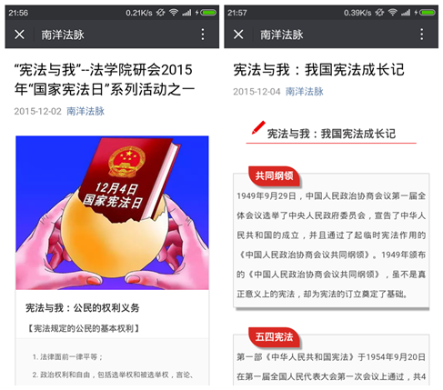 为了配合“国家宪法日”系列主题活动的顺利开展,乐动官方网页版法学院研究生会在院党总支、团工委的指导下,以“宪法与我”为主题,不断创新宣传载体,探索宣传方法,通过官方微信平台“南洋法脉”等新媒体,结合传统的发放传单等方式,积极推介“国家宪法日”相关内容,宣传法学院开展宪法学习宣传教育活动的实际情况,取得了良好的宣传效果。