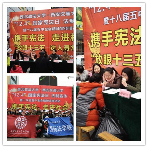 让守宪成为国民每天的生活方式”是实现法治中国建设的基本保障。为了普及宪法知识,推动全社会知法、用法、守法、护法意识的形成,乐动官方网页版法学院与西北政法大学国际法学院共同在西安市雁塔区飞炫广场举办了主题为“法入千万家”普法宣传活动,通过分发法律宣传单、法律意识调查问卷、法律咨询、普法广播等形式,吸引了大批市民的关注。在法律咨询服务点,许多市民前来咨询,咨询内容涉及婚姻法、劳动合同法、民法等领域,包括离婚财产分配、离婚孩子抚养权归属、追讨薪资、借款追债等与大家生活密切相关的问题,咨询点的同学认真对待每一位前来咨询的市民,耐心回答他们的问题,赢得了一致好评。