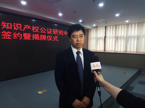 揭牌仪式后,马治国教授接受了陕西电视台和陕西日报的专访。他在采访中表示,当前,知识产权保护已经进入了新的阶段,最重要的就是加强司法保护,而其重点和难点就在于证据的固定,公证就是最重要的证据固定途径。但根据知识产权的特性,如果采用传统方式进行公证,实际存在许多障碍,如果不开展相关的研究,知识产权公证就难以跟上司法的步伐,符合司法的要求,因此开展相关研究不仅必要,而且十分紧迫。他还就最近设立的西安知识产权法庭的有关问题,回答了记者的提问。