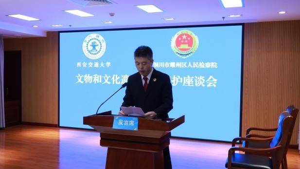 胡宇龙检察长致欢迎辞。丁卫副院长和刘丽娜副教授分别介绍了交大法学院近年来“校检合作”培养卓越法治人才的情况和在文物文化遗产法律保护领域所取得的系列教学科研成果。葛建华副检察长介绍了耀州区人民检察院近几年为文物和文化遗产提供检察保护所取得的突出成绩,其中1件案例还被最高人民检察院发布为典型案例。双方均表示,希望今后能够深化检校合作,实现教学科研机构和实务机关之间的优势互补、资源共享、共建共赢。